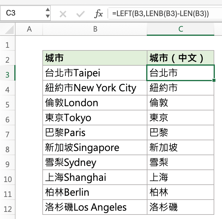「中文字」又剛好在最左邊,因此我們可以透過 LEFT 函數來將中文字擷取出來!