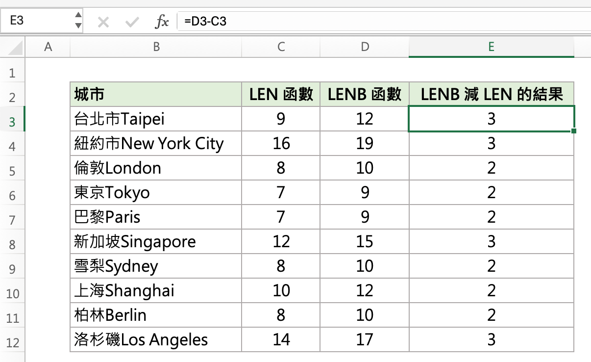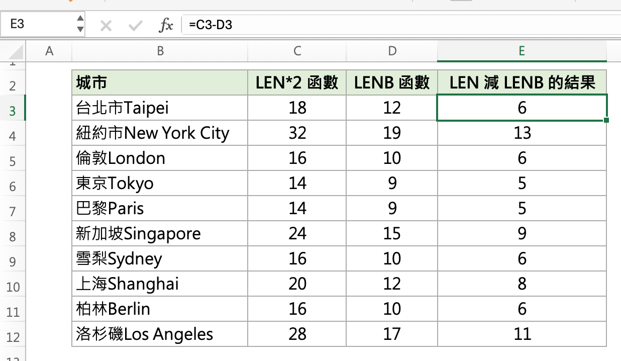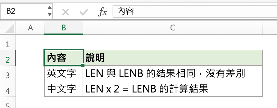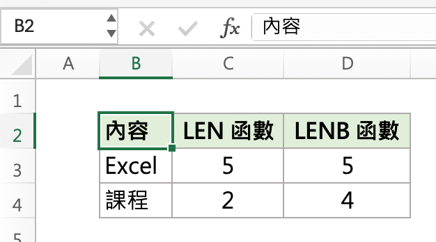請看下面這張圖,當我們分別用 LEN 函數與 LENB 函數計算儲存格內的字元時,