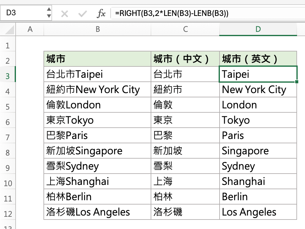 別忘了,當現在「中文字」換到右邊時,就要改用 RIGHT 函數;同理,當「英文字」在左邊時,就要改用 LEFT 函數。