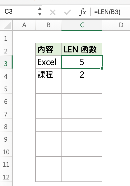如上圖所示,「Excel」共有 5 個英文字母,而「課程」則共有 2 個中文字。