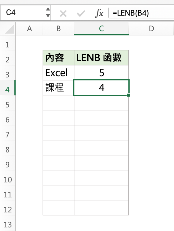 C4=LENB(B4) → 計算共有多少中文字字元組數