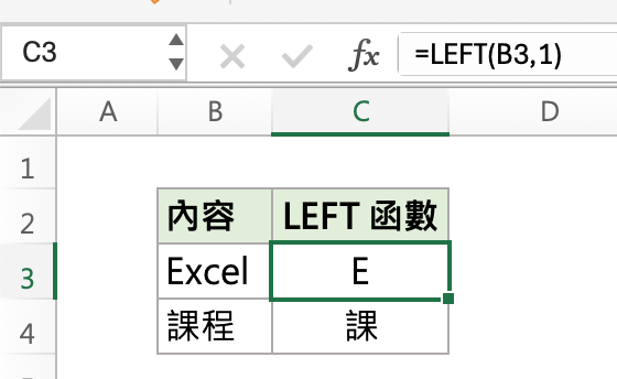 LEFT 函數的用途主要是截取儲存格內的資料,LEFT 顧名思義就是「截取左邊 n 位數的字元」