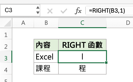 RIGHT 函數則是與 LEFT 函數完全相反,代表「截取右邊 n 位數的字元」。