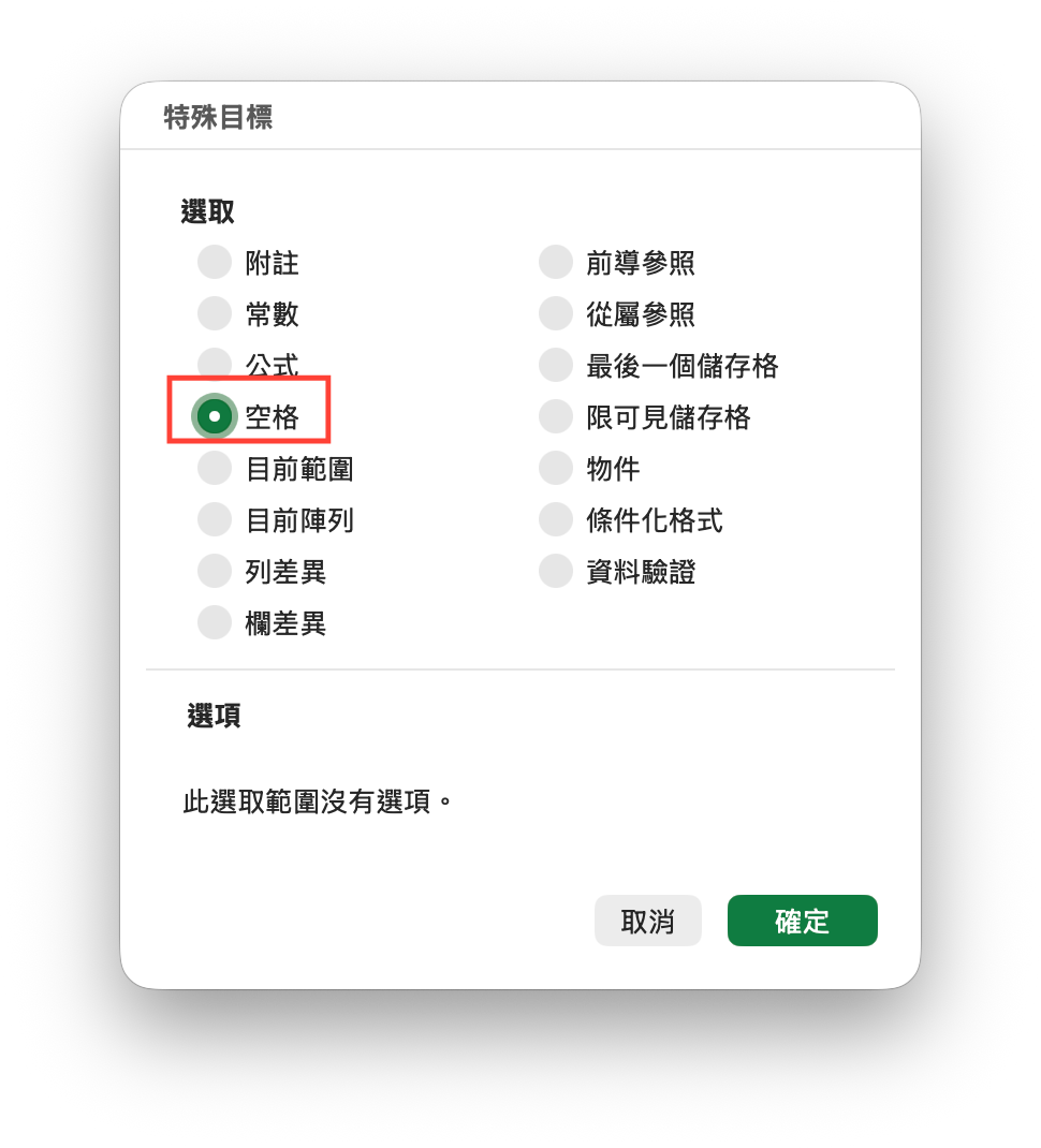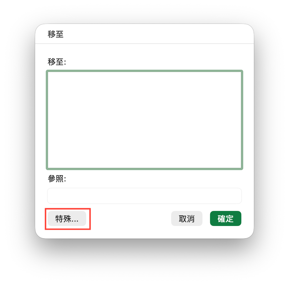 按下快捷鍵 F5(或 Ctrl + G),在跳出的視窗中點擊左下角的 「特殊」。