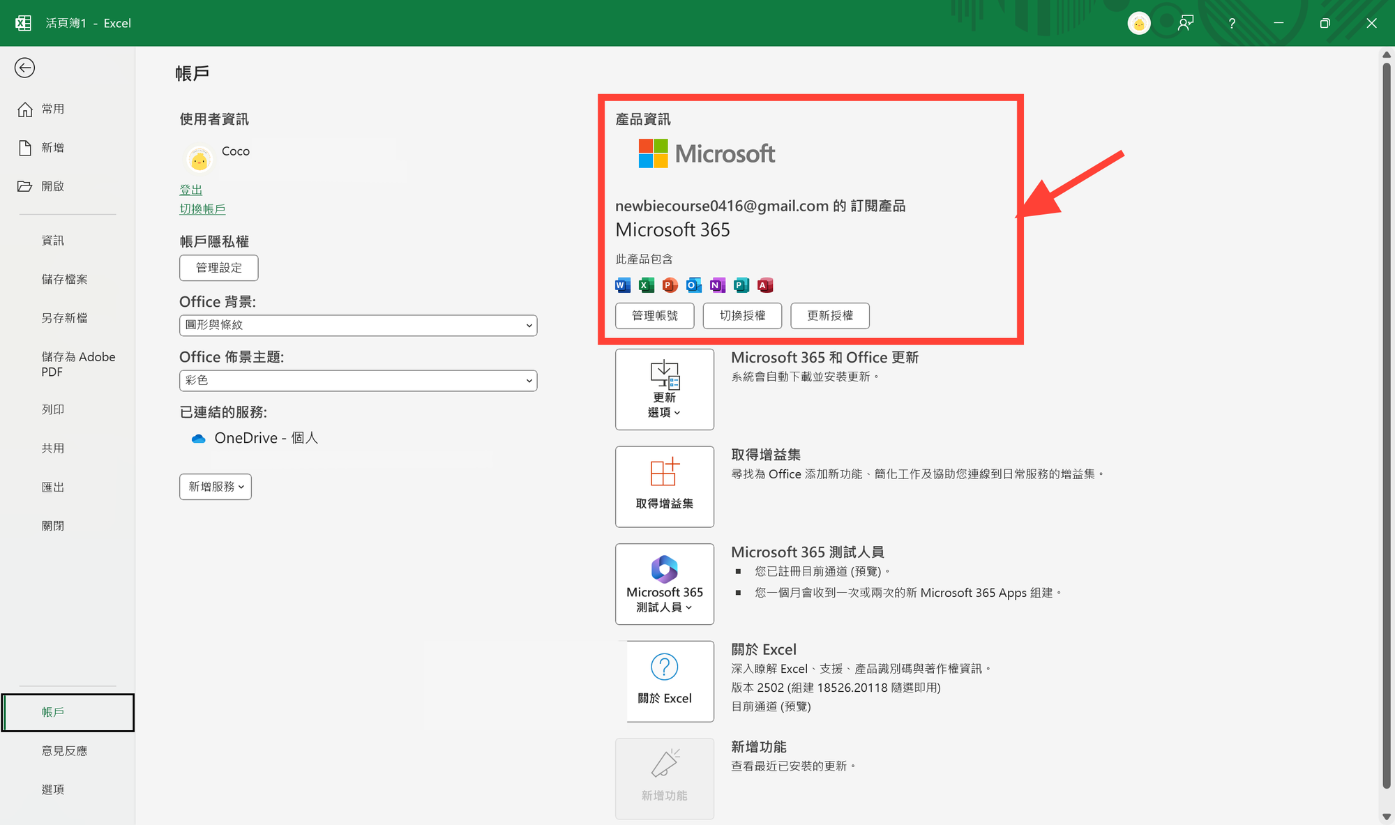 - 就可以在右上角看到自己的 Excel 版本囉!