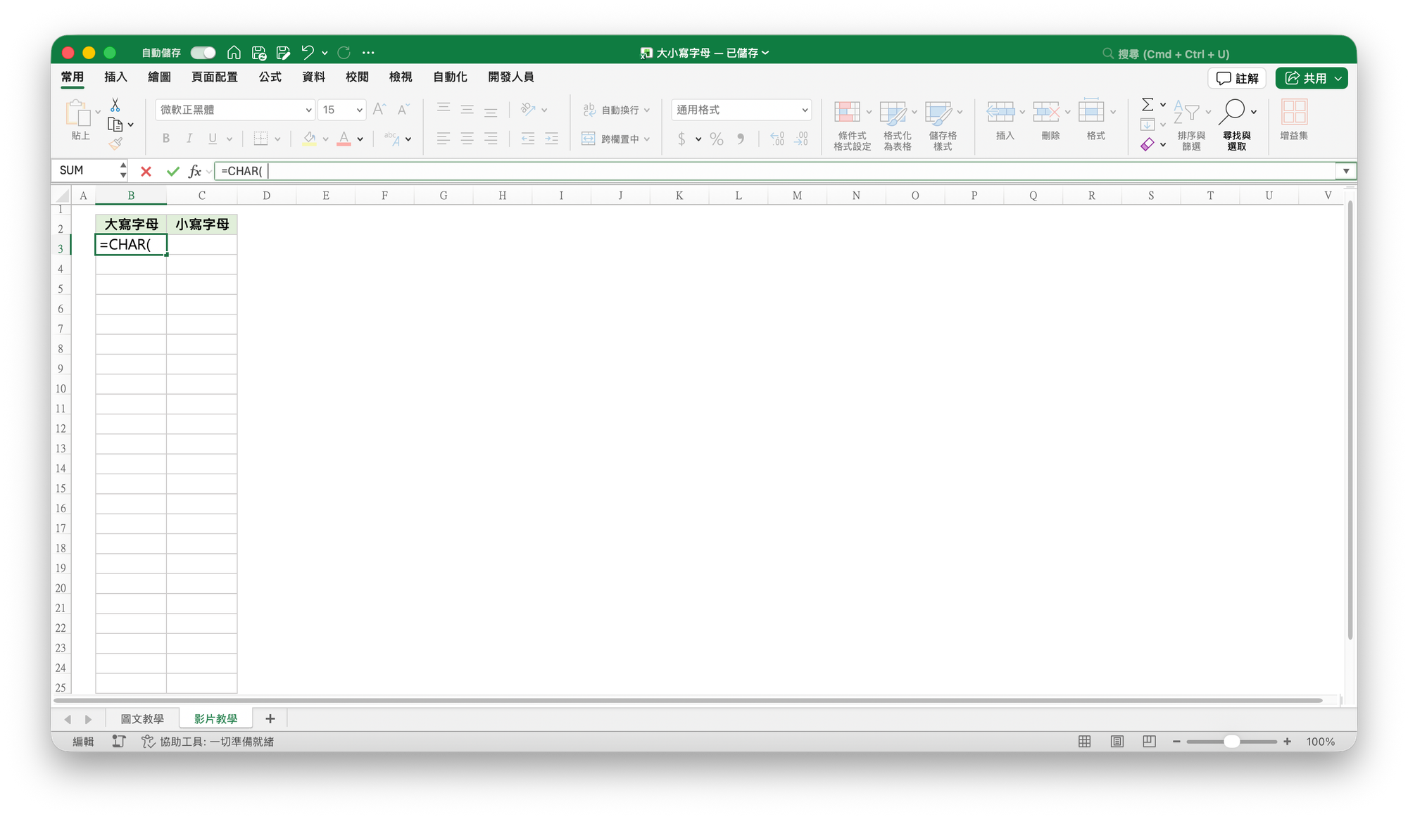 在 Excel 中利用 CHAR 函數,可以將 ASCII 編碼數字轉換成對應的英文字母。