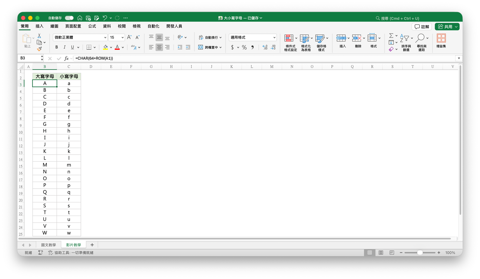 =CHAR(64+ROW(A1))- 說明: 大寫 A 的代碼是 65,透過